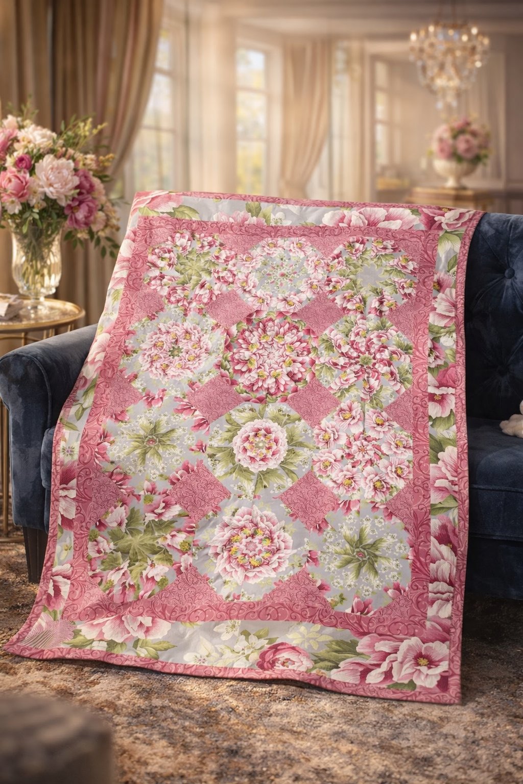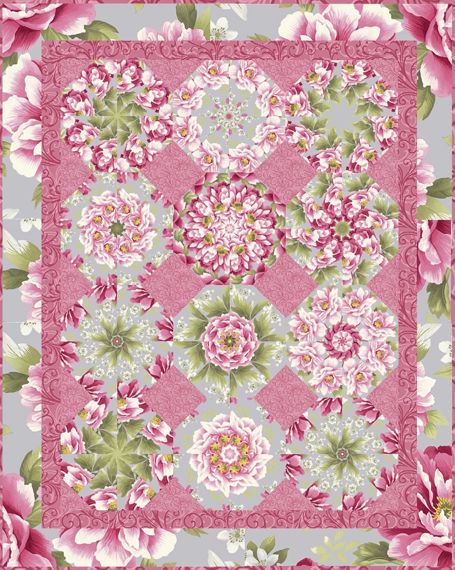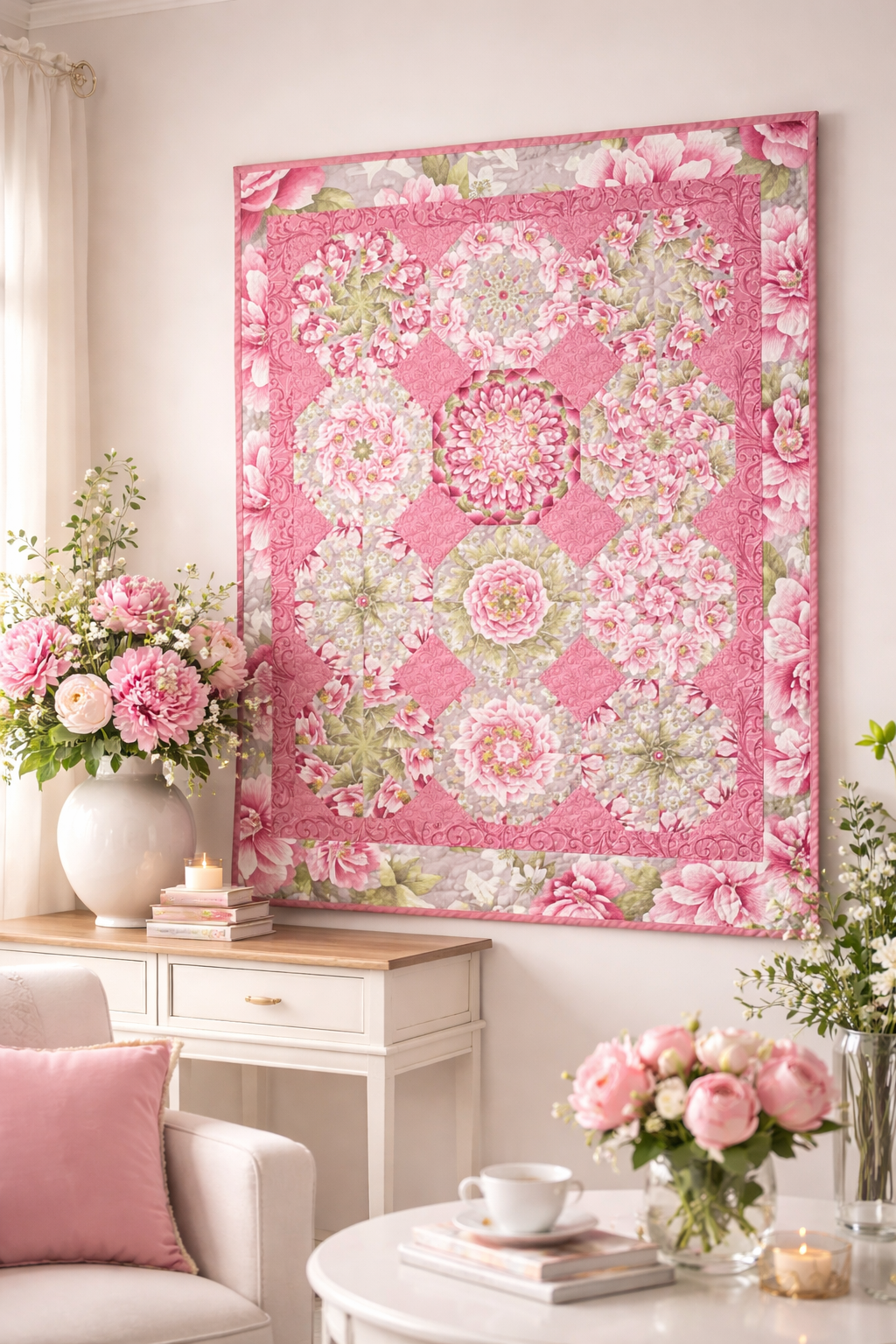 This kit enables you to create a stunning 40″ x 50″ quilt top as displayed. Included in the kit are detailed instructions for crafting your Kaleidoscope Blocks and assembling the quilt, along with ample pre-cut (hand-cut) kaleidoscope blocks to form 12 blocks, each measuring 10″ square. Every block features 8 wedges in the focal Camellia Floral fabric and 4 cornerstones in a coordinating pink scroll print. The kit also provides inner and outer border fabrics as well as binding, as shown.