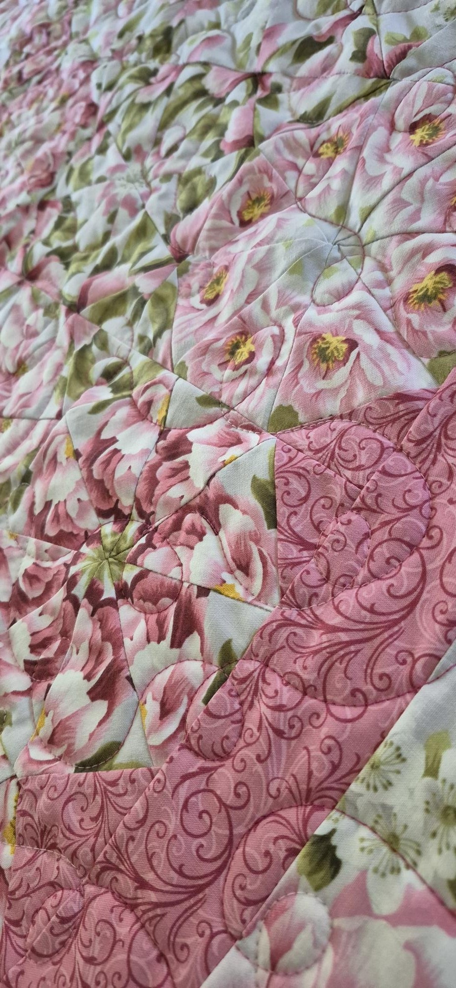 Every detail in this quilt creates a delicate, symmetrical floral design that feels both romantic and eye-catching—perfect for adding warmth and beauty to any space.