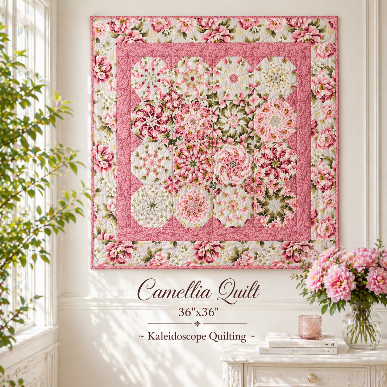 Camellia Quilt 36″x36″ | Handmade Floral Quilt Wall Hanging | Kaleidoscope Quilt | Pink Cottage Chic Decor | One of a Kind Quilt