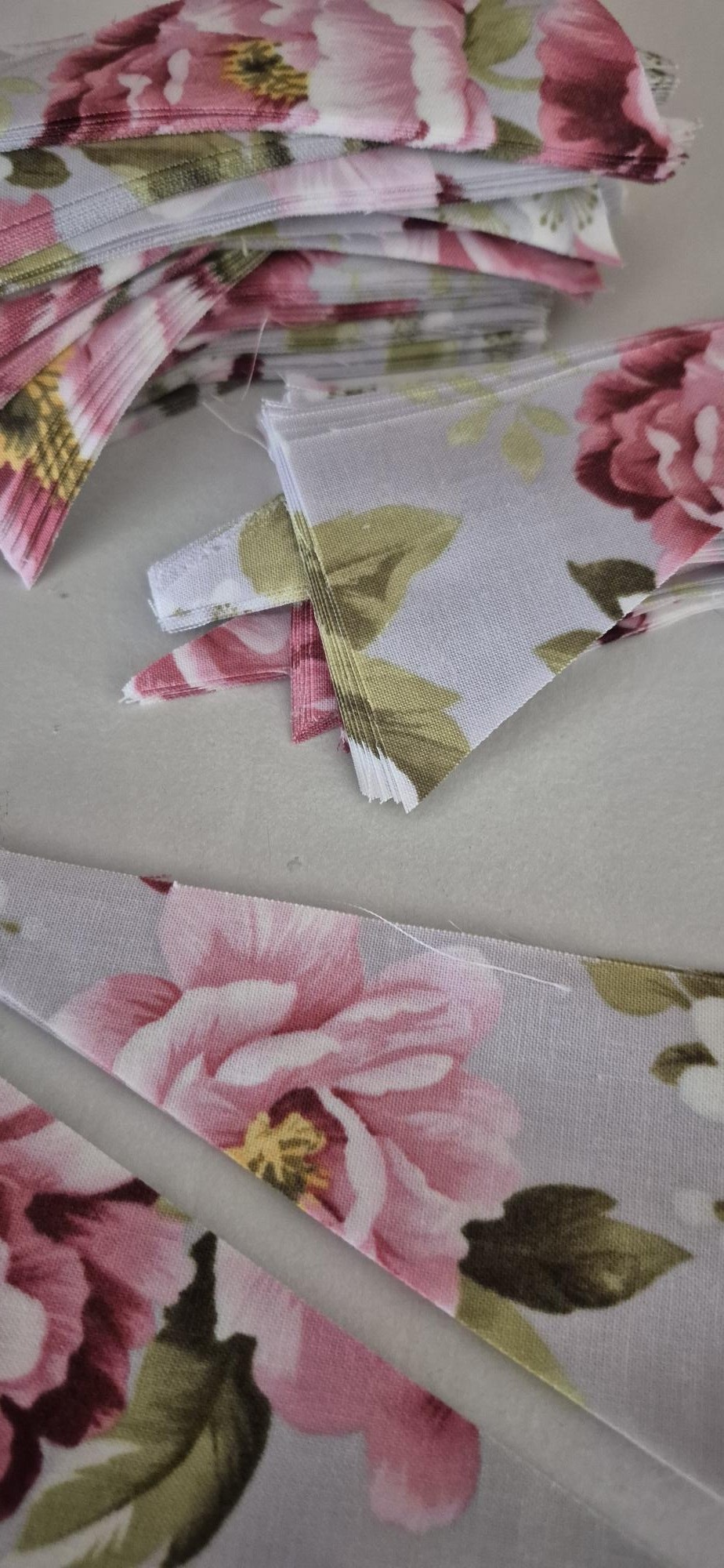 320 Piece of quilt shop quality fabric scraps, each piece is approximately 2.5″x5″ and cut on the diagonal.