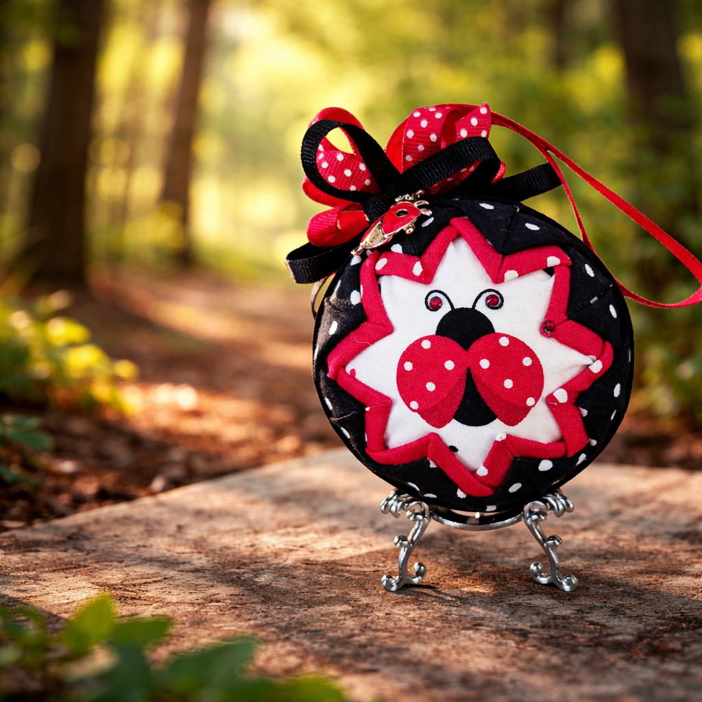 This one-of-a-kind piece features a sweet ladybug design in classic red, black, and white polka dots, finished with a decorative bow and delicate charm detail. Set against a soft woodland-inspired look, it makes a perfect gift or collectible.