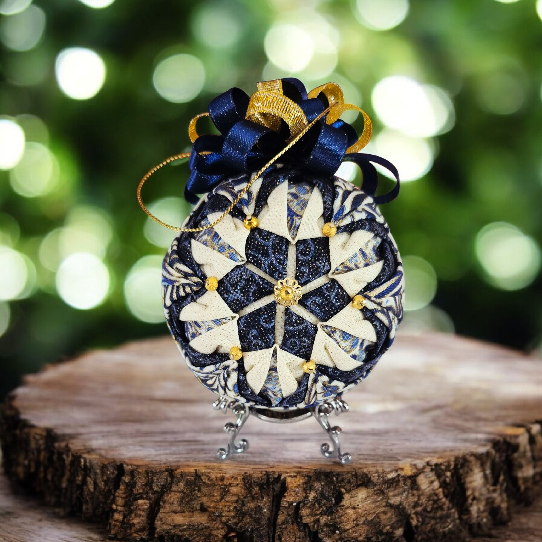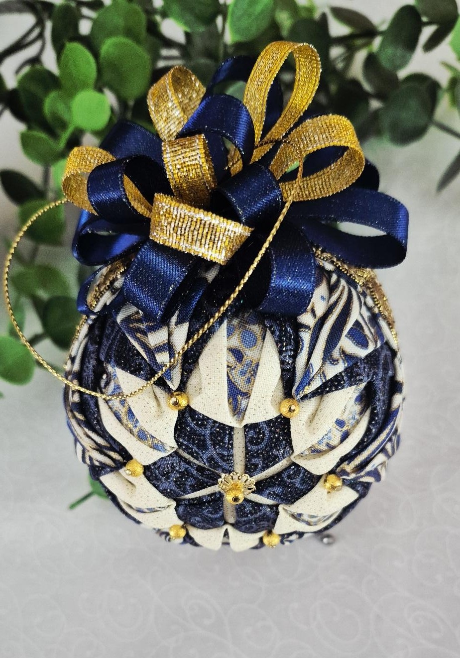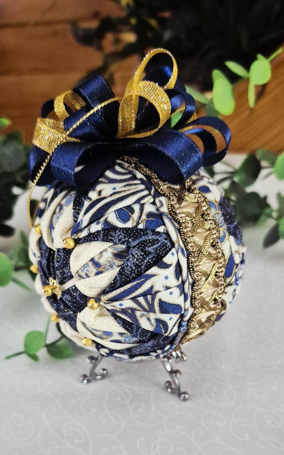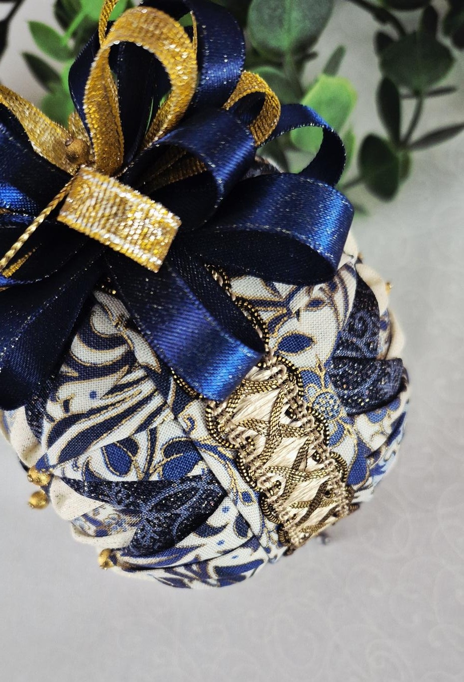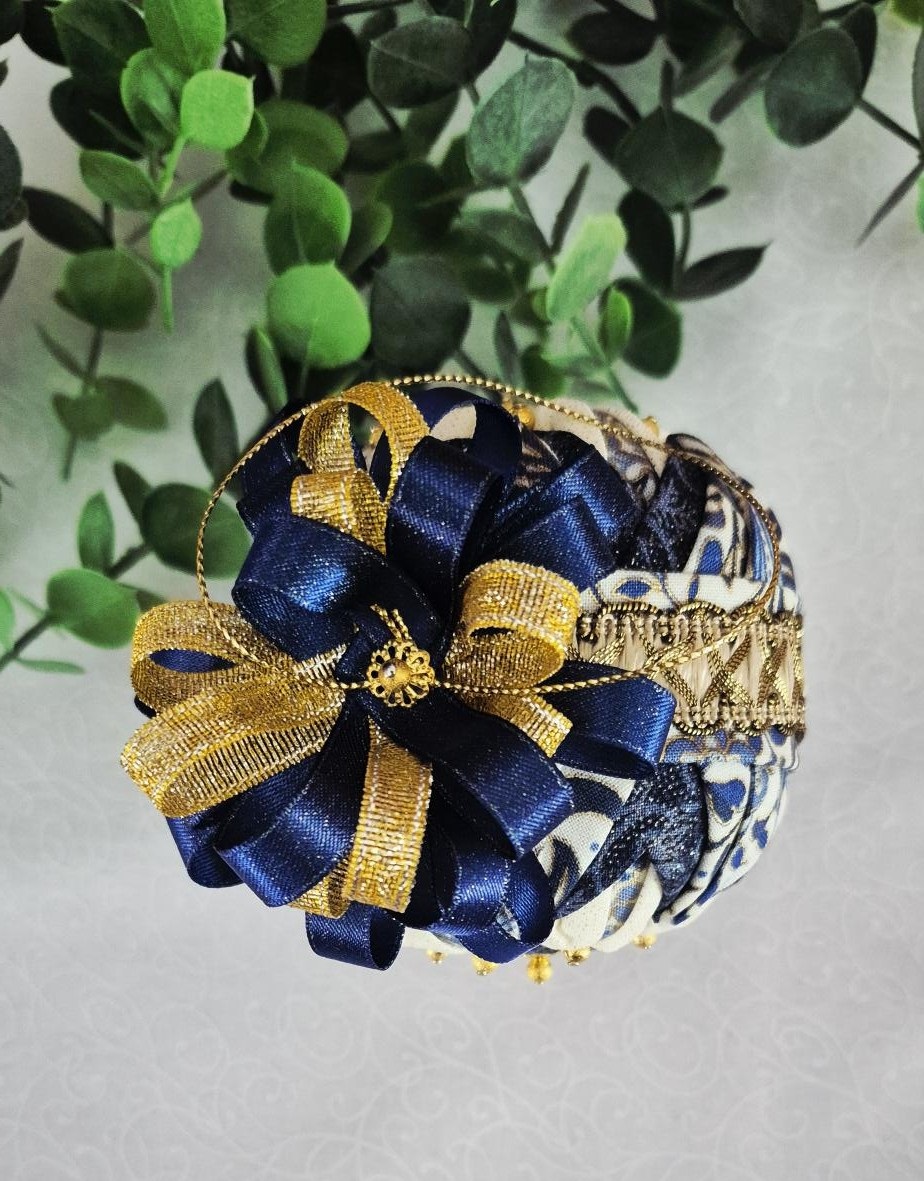 Crafted with a Styrofoam ball as the base and adorned with fabric, ribbon, and pins, it’s truly stunning.