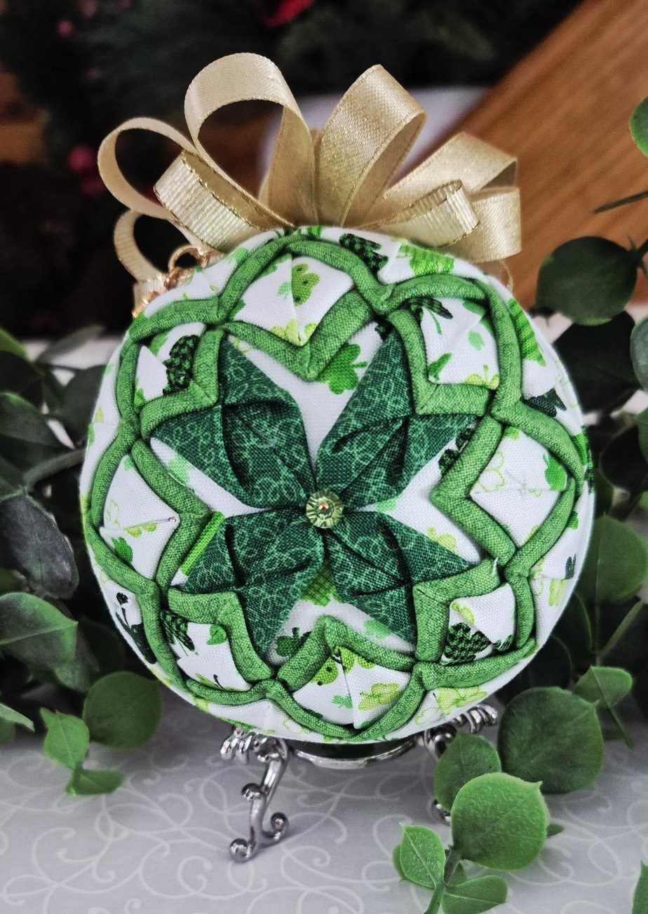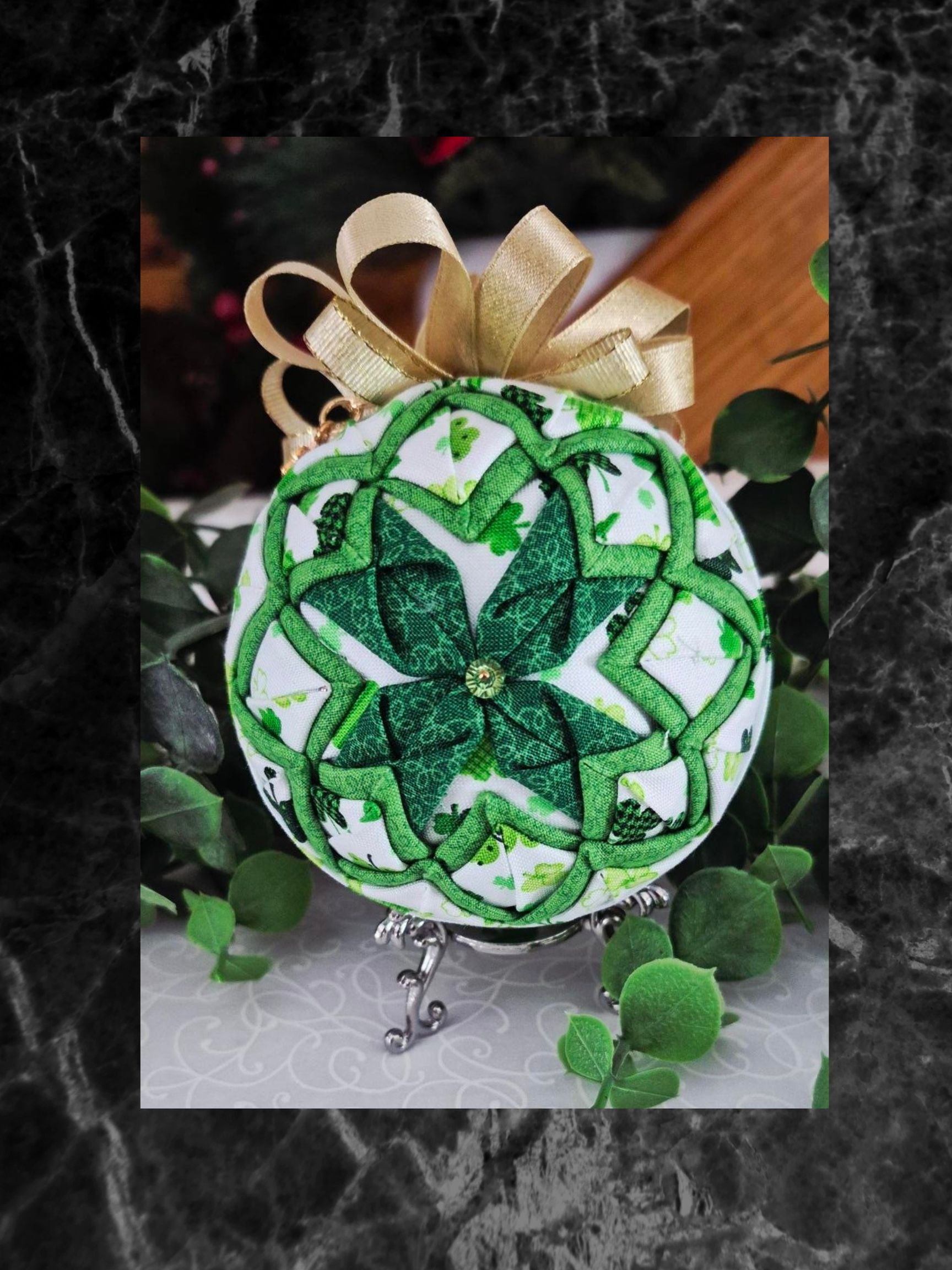 Crafted with a Styrofoam ball as the base and adorned with fabric, ribbon, and pins, it’s truly stunning.