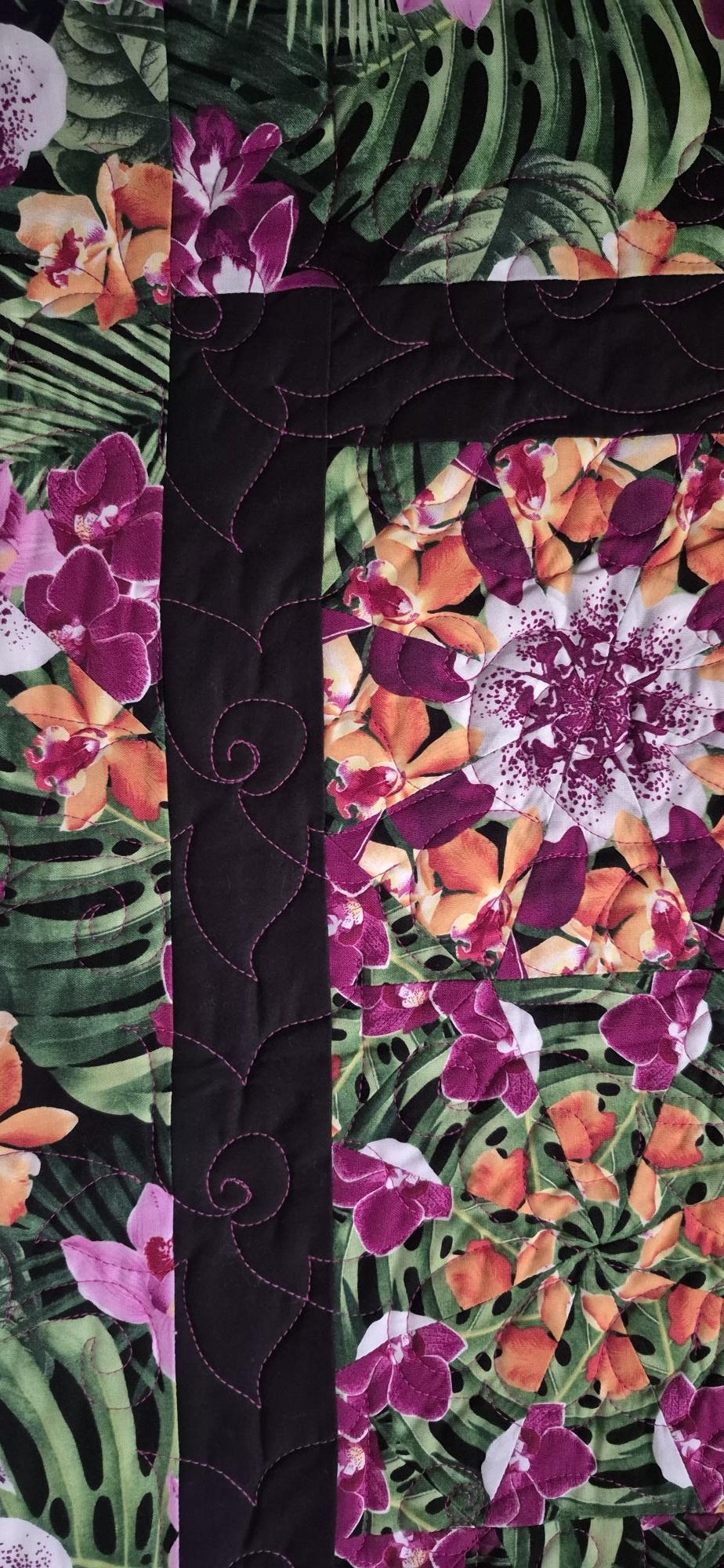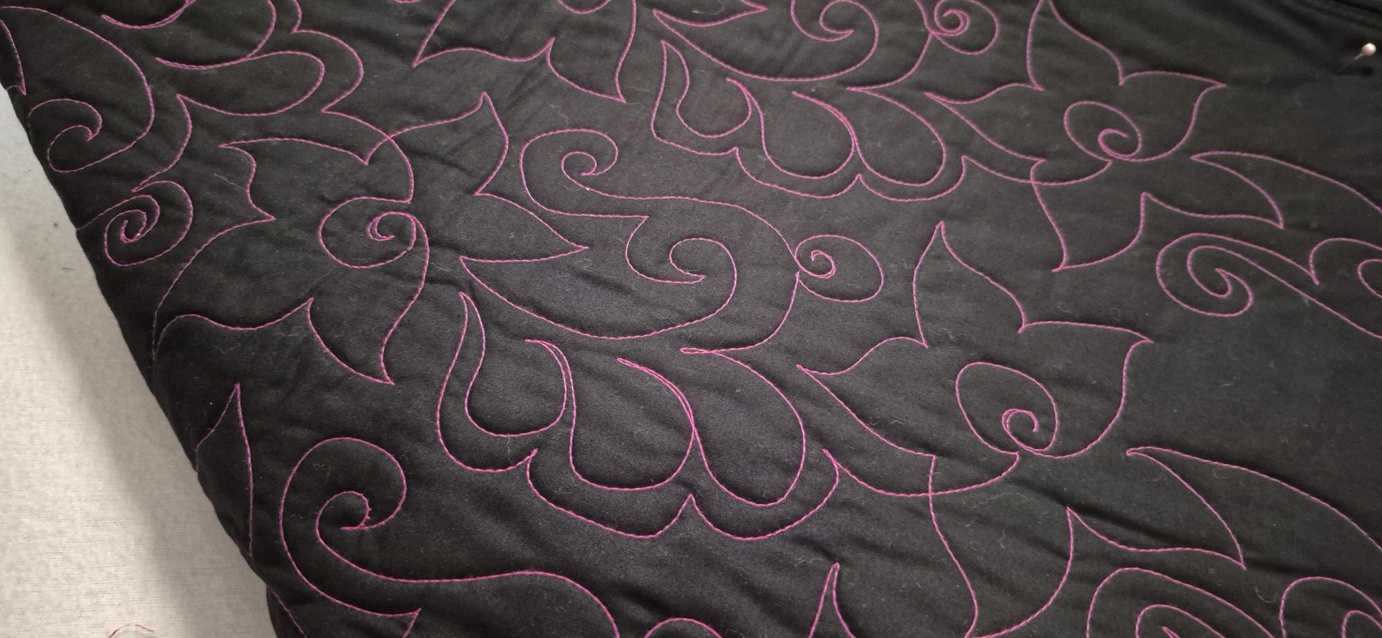 Quilting is in a beautiful pink thread, backing is classic black fabric as shown.
