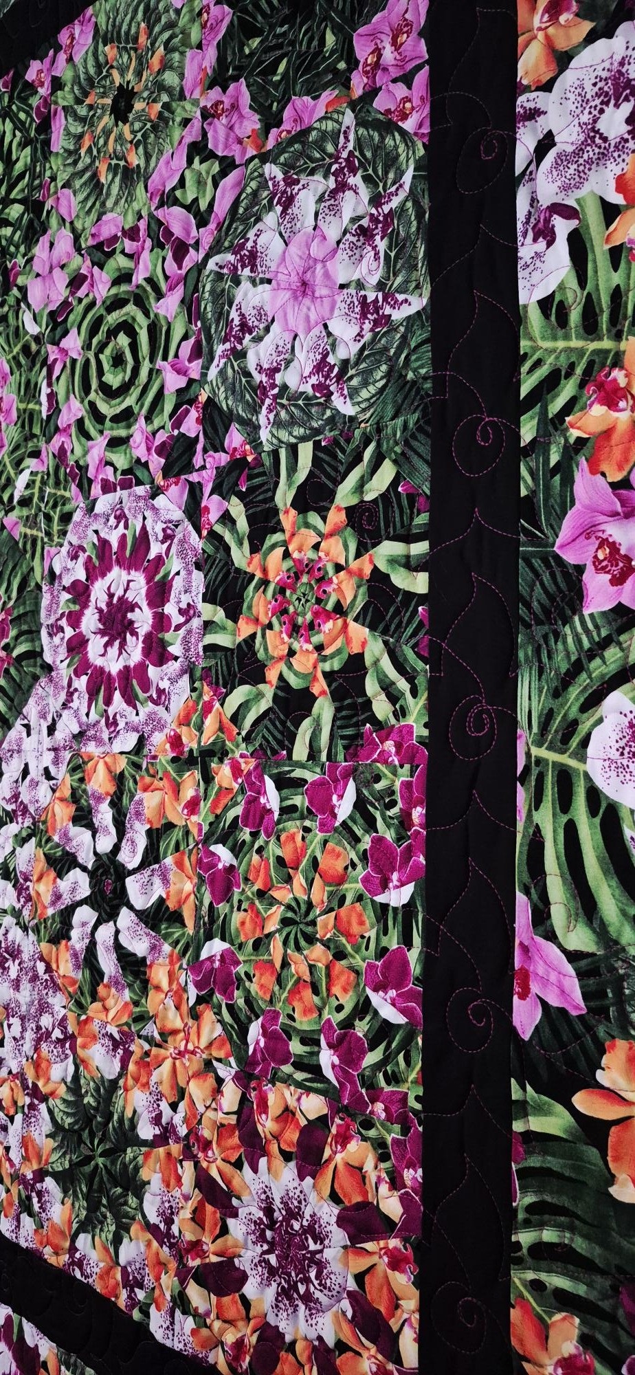 This stunning Tropical Fleur Kaleidoscope Quilt is sized at 41″x48″