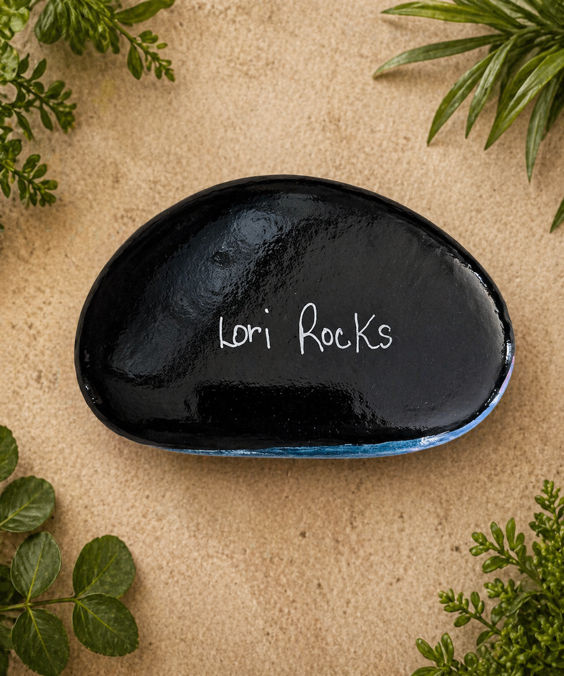 Natural stone – shape is organic and unique and it does say ‘Lori Rocks’ on the back.