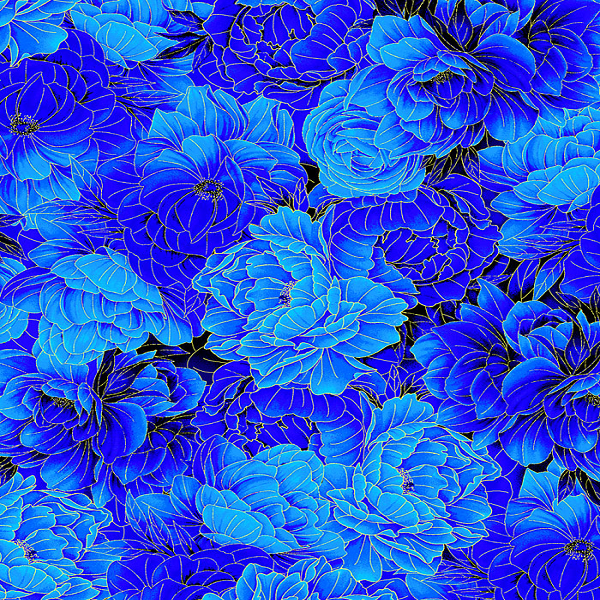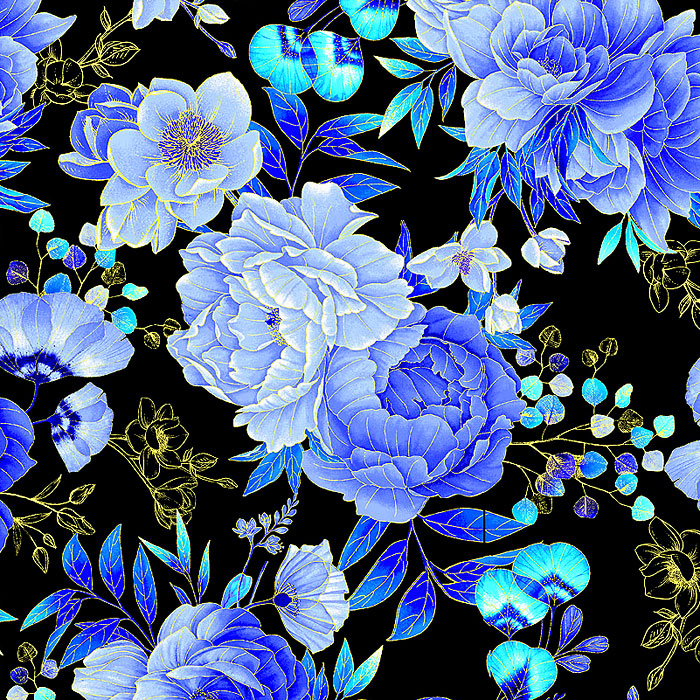 This beautiful bundle features rich blue prints paired with a classic black for striking contrast — perfect for eye-catching quilts and festive projects.