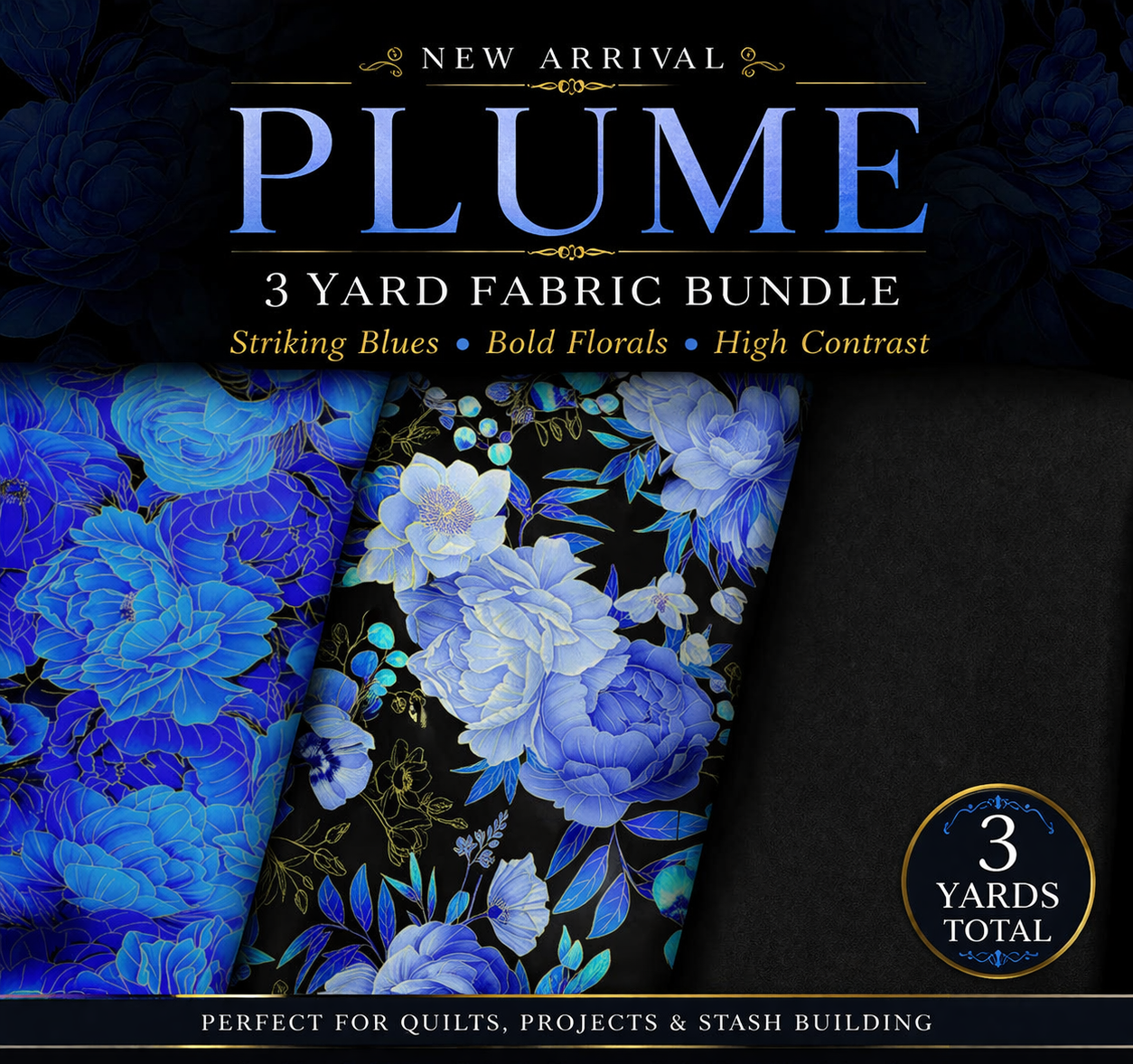 Plume 3 Yard Fabric Bundle, Blue Floral Fabric, Black Background Quilt Fabric, High Contrast Quilting Cotton, Precut Fabric Bundle